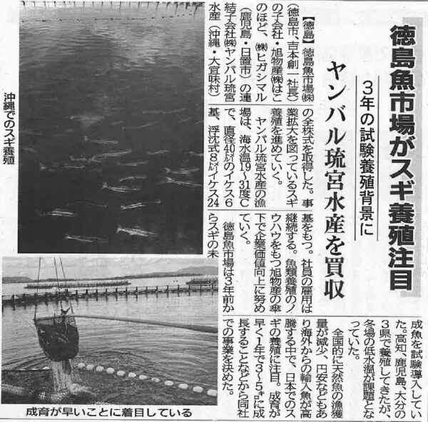 弊社グループ会社の「徳島魚市場がスギ養殖注目」の記事が掲載されました。